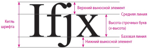 Почему некоторые шрифты кажутся крупнее по сравнению с другими, хотя они имеют один и тот же размер? Это связано с х -высотой. х -высота - высота строчных букв без выносных элементов в данном семействе шрифтов. Каждый шрифт характеризуется собственной х -высотой, поэтому одни шрифты кажутся крупнее других, хотя на самом деле они имеют одинаковый кегль (рис. 4).